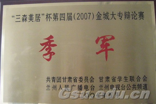 【本网讯】[记者马永良 通讯员张雯静] 备受全省关注的由共青团甘肃省委、甘肃省学生联合会、兰州人民广播电台和兰州电视台公共频道主办,以贯彻和落实科学发展观、积极构建社会主义和谐社会为主题的“ 三森美居 ”杯第四届(2007)金城大专辩论赛已于5月19日在省政府礼堂落下了帷幕,beat365代表队勇夺季军,为学校争得了荣誉,充分展示了beat365当代大学生的精神风貌和青春风采。