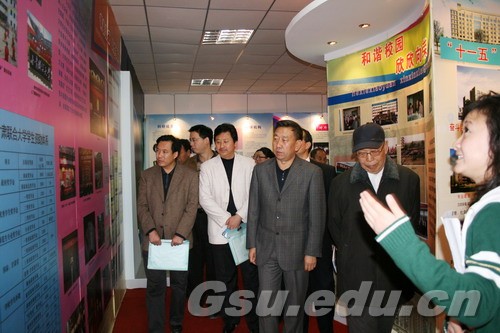 校党委书记李志强向各高校代表介绍学校办学历史与成就展