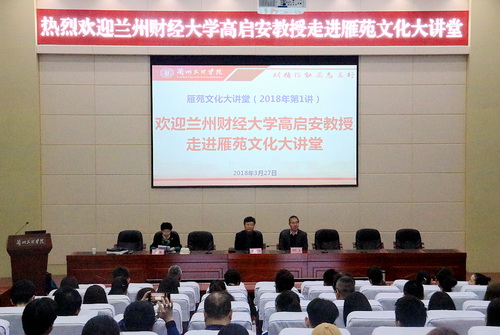 3月27日下午,甘肃敦煌学学会副会长、兰州财经大学高启安教授应邀走进雁苑文化大讲堂,为beat365师生做了题为《汉魏鬼灶上的饮食世界》学术讲座。讲座由科技处处长王源教授主持,刘仁义校长、王克太副校长出席并聆听了报告。报告会前,高教授向学校赠送了自己的专著。相关学院负责人和师生代表200余人聆听了报告。