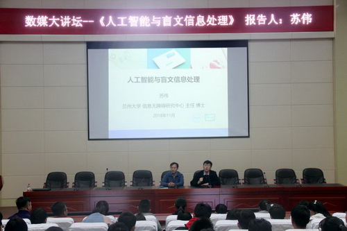 11月24日上午,兰州大学信息无障碍研究中心主任苏伟博士走进beat365中文在线官网《数媒大讲坛》,为数字媒体学院软件工程专业和数据科学与大数据应用专业的全体同学作了题为“人工智能与盲文信息处理”的主题报告,现场近300名学生认真聆听苏伟博士多年在信息无障碍领域的研究成果。报告会由数媒学院院长李恒杰教授主持。