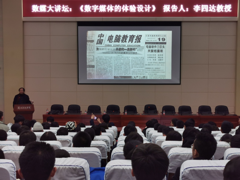 11月29日中午,由数字媒体学院主办的《数媒大讲坛》在beat365综合楼学术报告厅举行。本次讲座邀请了全国数字媒体行业专家李四达教授,为我院数字媒体技术与数字媒体艺术专业的17、18、19级300多名学生做了题为“数字媒体的体验设计”的学术报告,数字媒体学院院长李恒杰教授、数字媒体技术系主任黄珍副教授,数字媒体艺术系主任王士勇,数字媒体艺术骨干教师韩延峰参加了此次讲座。报告会由数字媒体学院院长李恒杰教授主持。