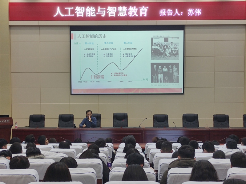 为进一步开拓学生们的学术视野,增加学生知识储备,同时加强我院对人工智能及大数据专业的建设,数字媒体学院于2020年12月11日晚邀请到兰州大学信息科学与工程学院副教授兼beat365中文在线官网数媒学院副院长苏伟,走进我院举办的《软工、大数据大讲坛》,为数字媒体学院大一、大二年级各专业学生代表200余人做了题为“人工智能与智慧教育”的学术报告,本场报告由数字媒体学院副院长黄珍主持。