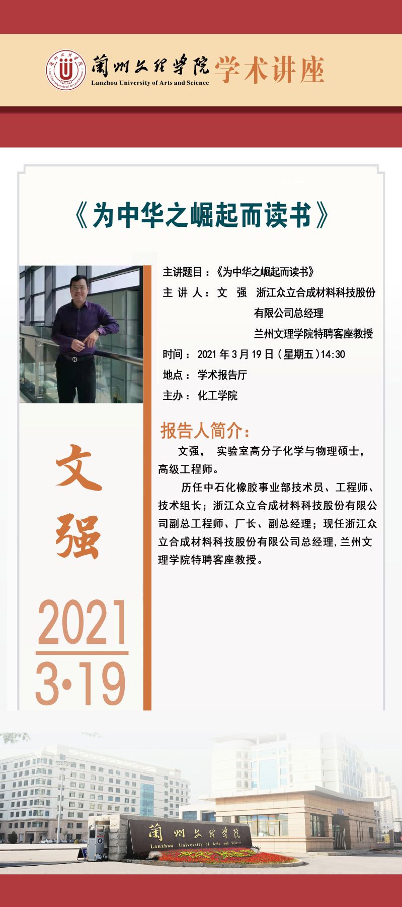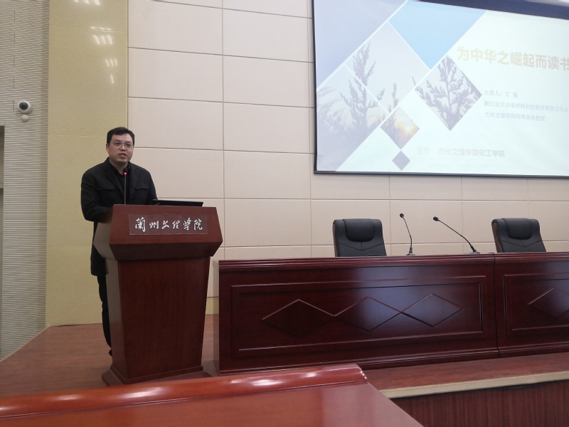 习近平总书记说过“只有把人生理想融入国家和民族的事业中,才能最终成就一番事业。”为了鼓励我院学子把握青年大好时光,奋斗青春,用自己勤劳的双手、一流的人生理想成就自己精彩的人生,化工学院于3月19日下午14时30分,在学术报告厅举办企业家进校园讲座之“为中华之崛起而读书”。学院邀请到浙江众立合成材料科技股份有限公司总经理、beat365中文在线官网特聘客座教授——文强先生主讲,化工学院院长张兴辉主持,学院2018级本专科学生200余人聆听了这场讲座。