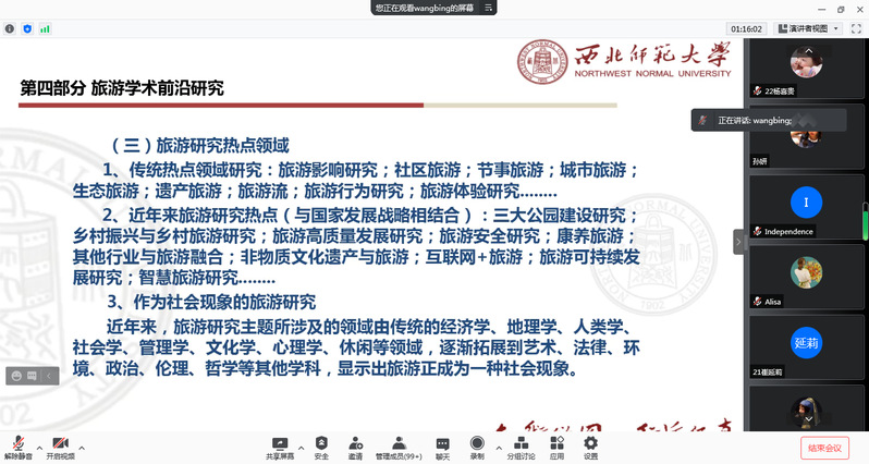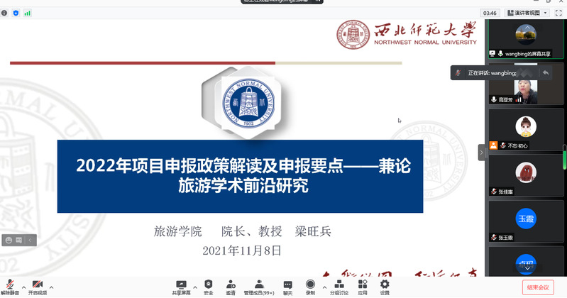 为进一步提升学院整体科研教学水平,实现疫情期间“停课不停学、在家也要积极做科研”的目标,10月9日,旅游学院邀请西北师范大学旅游学院院长梁旺兵博士、教授为学院旅游管理、酒店管理、航空服务艺术与管理专业的本科学生做了题为《2022年项目申报政策解读及申报要点——兼论旅游学术前沿研究》的专题学术讲座,讲座通过腾讯会议在线直播的方式进行,学院330余名师生进行了收听,此次讲座由旅游学院院长高亚芳教授主持。