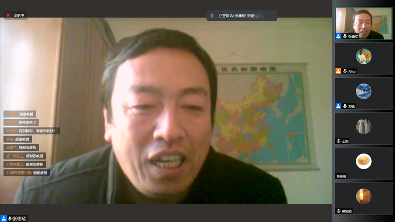2021年11月11日15:00旅游学院召开了题为“文旅资源跨界与创新”的线上学术讲座。本次学术讲座由学院党总支副书记刘锐主持,主讲嘉宾为中关村智慧旅游创新协会会长、旅游创业创新研究院执行院长张德欣教授,参加本次讲座的成员有学院部分老师和全体同学。