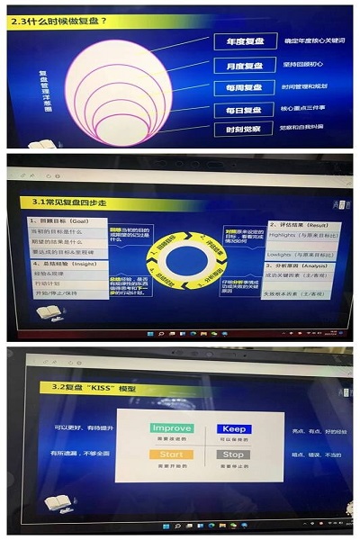 七月老师首先介绍了复盘以及什么是四大核心复盘方法,从优化流程-总结经验-加速成长-分析原因-避免错误几个方面以生动形象的语言给大家呈现了复盘的重要性,展示了复盘对工作、学习、家庭、娱乐、其他等方面的用处。随后,七月老师利用KISS法则和4F复盘分别对年度、月度、周、日复盘图进行了详细解释;让同学们通过亲自参与“月度之花、TO DO LIST”等形式来体会复盘的具体做法,同时七月老师又教给大家用“今日小确幸、今日待提升、明日之计划”来提高幸福感、成就感。七月老师建议同学们先处理情绪,再处理情况;先解决心情,再解决事情。