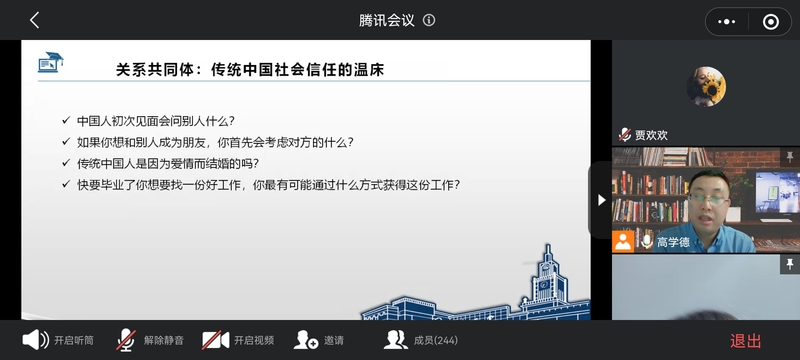 2021年12月9日,兰州大学管理学院高学德教授应邀为我院师生开展讲座。此次讲座以线上会议的方式进行,围绕“流动的信任:现代性视野中的信任变迁及重塑”这一主题展开,讲座由经济管理学院院长秦梓华主持,学院200余名师生共同参加。