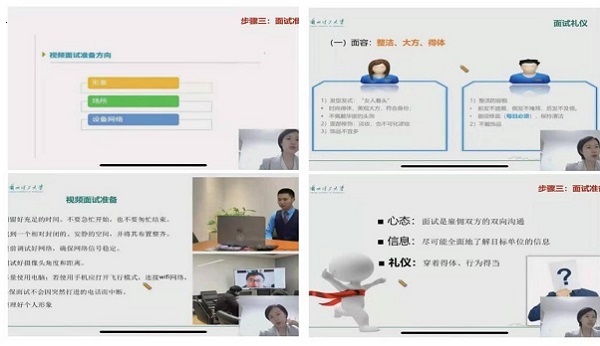讲座最后,马老师为同学们详细的讲解了面试准备、面试礼仪、视频面试及准备面试方向,帮助同学们树立正确的就业价值观,进行科学的职业生涯规划。