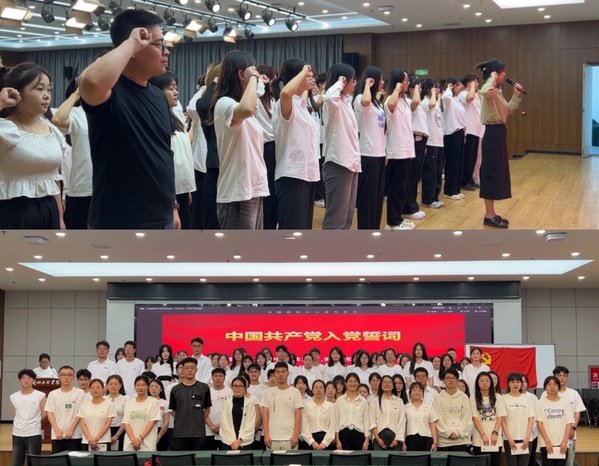 庄严的《国际歌》后,由工管系学生党支部书记领誓,预备党员面向党旗庄严宣誓,正式党员一同重温誓词。正式党员为新党员配戴党徽,新党员将更加明确身份、勇于担当、努力学习,为学校高质量发展做出自己的努力。