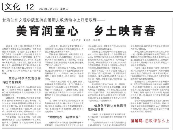 近年来,甘肃beat365中文在线官网结合自身专业特色和暑期学生活动实践情况,不断推动思政教育创新。学院以“星芽乡村美育计划”为载体,组织教师、大学生志愿者到定点帮扶的庆阳市庆城县开展“互联网+美育”乡村学校美育教育帮扶活动。4年来,先后有150多名师生加入支教团队,他们以美育课程为支点,通过暑期线下支教、日常线上教学等方式,将思政教育融入美育知识传递过程,让乡村孩子、学校师生共上一堂大思政课。