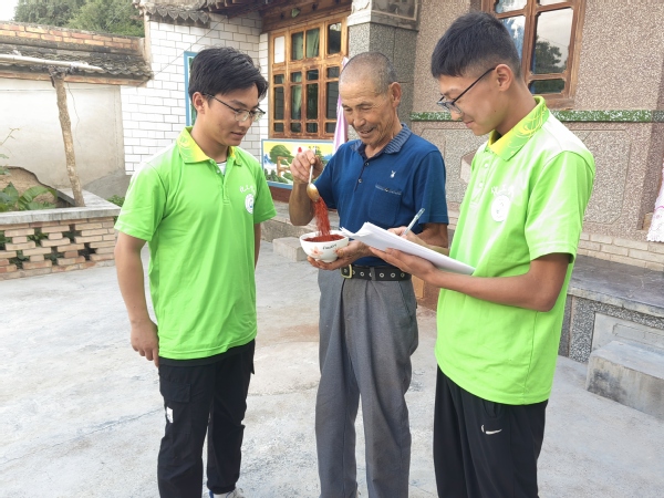 在调研基础上,实践团队结合安远镇的实际情况完善了前期准备的调查问卷,开始逐户走访基地附近辣椒种植户,探询农户种植中遇到的难点、疑点,归纳整理后反映给了当地村政府。问卷调研中,团队成员还为种植户们讲解了最新的农业政策。