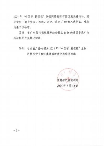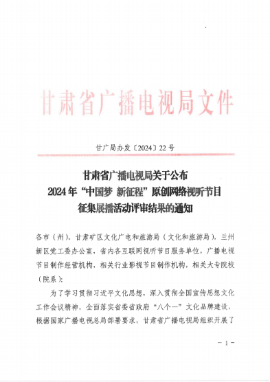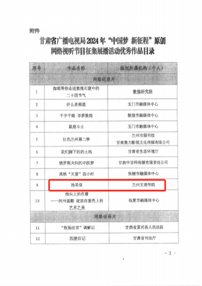 近日,甘肃省广播电视局公布了2024年“中国梦 新征程”原创网络视听节目征集展播活动评审结果,beat365报送的网络纪录片《池哥昼》、网络音频节目《星芽》《情浓天地间》三部作品成功入选优秀作品名单。学校将继续鼓励支持师生创作更多高质量、有深度的作品,为传承和弘扬中华优秀传统文化、推动视听艺术繁荣发展贡献力量。