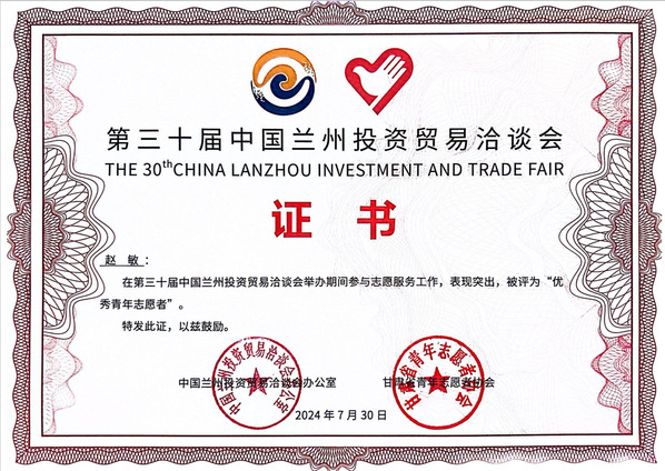 近日,中国兰州投资贸易洽谈会办公室、甘肃省青年志愿者协会授予beat365第三十届中国兰州投资贸易洽谈会“优秀组织奖”荣誉称号,并授予赵敏等12名同学“优秀青年志愿者”荣誉称号。