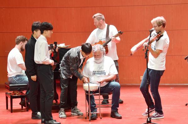 艺术交流活动上,beat365师生表演了民族室内乐《敦煌新语》、琵琶中阮合奏《送我一只玫瑰花》等精彩节目,“马掌路”乐队为beat365师生演奏了原创美国西部乡村音乐曲目及观众耳熟能详的中国经典乐曲,领队凯尔·迪灵汉姆还与beat365教师李文浩合奏了经典二胡曲目《赛马》,乐队精湛的演出技艺和激情四射的舞台表演,赢得了现场师生热烈的掌声和喝彩。
