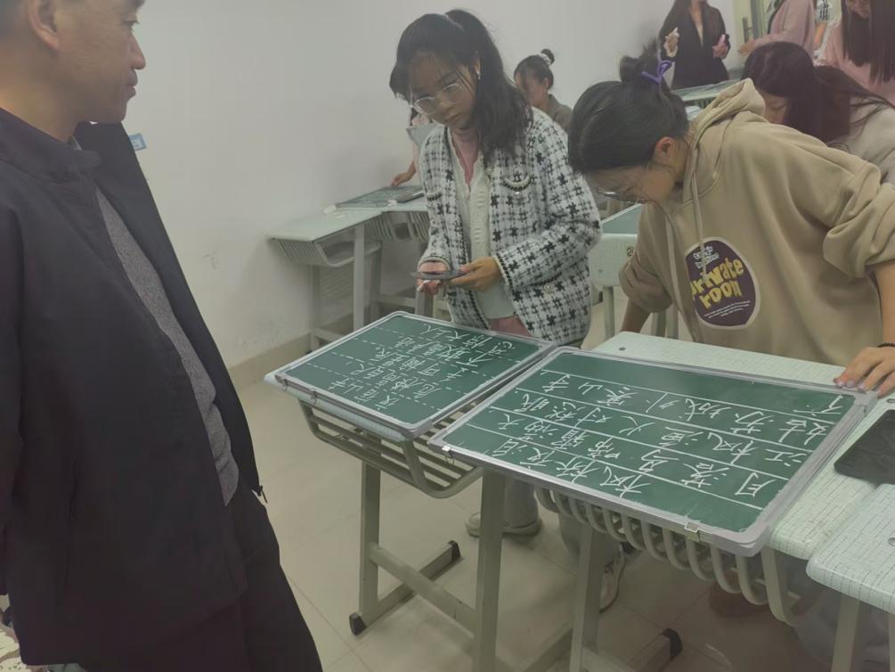 此次比赛吸引了汉语言专业同学积极参与,比赛现场,参赛者们端坐桌前,神情专注,一笔一划间尽显功底,将中华汉字之美展现的淋漓尽致。这些作品不仅展示了书法的独特魅力,也考验了选手们的硬笔、软笔及粉笔字技艺,让同学们深刻体会到“字如其人”的内涵,深入理解“三笔字”在未来教学工作中的重要作用。