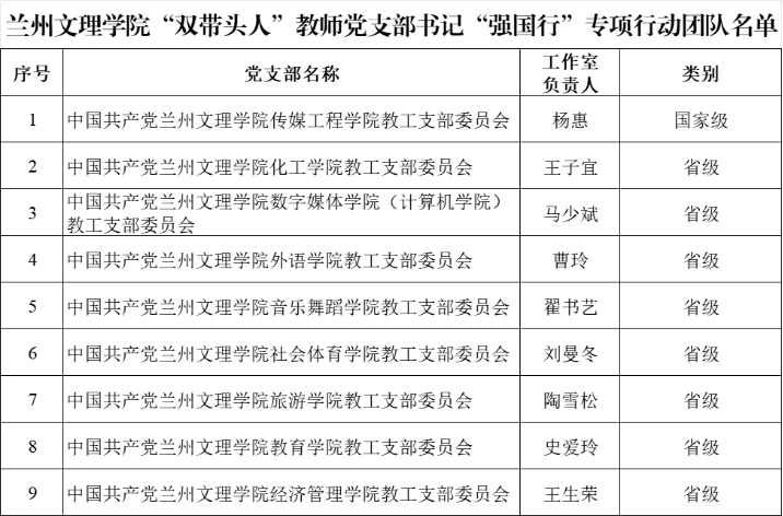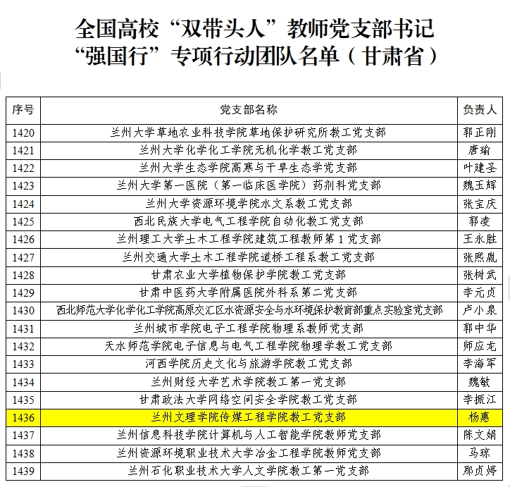 全国高校“双带头人”教师党支部书记“强国行”专项行动旨在落实立德树人根本任务,深入贯彻落实教育部党组关于高校“双带头人”教师党支部书记培育工作的部署要求,充分发挥高校“双带头人”的示范引领作用,引导广大师生在以中国式现代化全面推进强国建设、民族复兴伟业新征程上砥砺新担当,展现新作为。据悉,此次甘肃省共有20个高校党支部入选全国高校“强国行”专项行动团队。