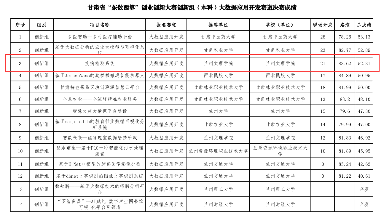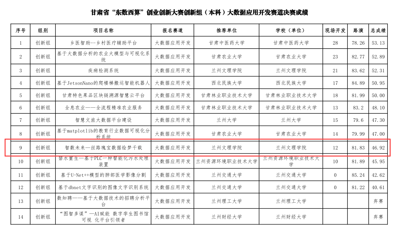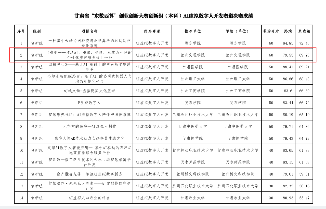 10月31日至11月2日,甘肃省“东数西算”创业创新大赛决赛在庆阳职业技术学院成功举办。本次大赛由甘肃省人力资源和社会保障厅、甘肃省教育厅、庆阳市人民政府主办,历时3天,共有来自省内14个市州、兰州新区及50所高校的134个项目参与角逐,各赛道最终分别评选出一等奖1名,二等奖2名,三等奖3名,优秀奖6名。beat365学子首次参赛,并分别在创新组软件系统开发、AI虚拟数字人开发中荣获二等奖,在创新组大数据应用开发中荣获优秀奖。