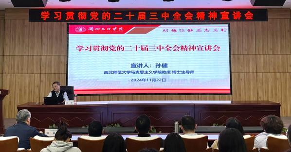 11月22日下午,学校在文昌楼303学术报告厅举办深入学习贯彻党的二十届三中全会精神专题宣讲会。此次宣讲会特邀西北师范大学马克思主义学院博士生导师孙健教授主讲,由校党委委员、副校长张焱教授主持,经济管理学院、社会体育学院200余名师生参加。