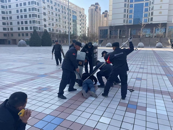 此次演练中,工作人员模拟不明身份人员手持砍刀未经允许进入校园冲入人群,面对突发警情,学校安保人员迅速反应,携带防暴叉、盾牌等防暴器械对“歹徒”形成了合围,快速控制了“歹徒”。现场演练人员反应迅速、处置果断,准确模拟报告、报警、运用防暴设备、人员疏散、封锁控制等情景。