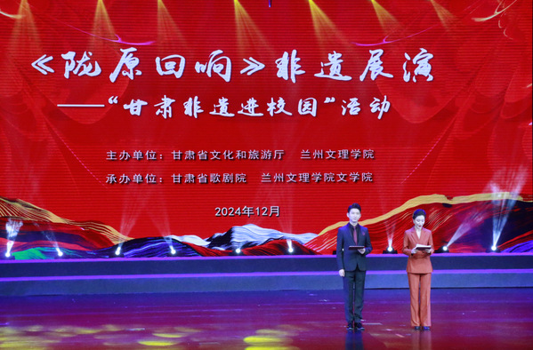 12月9日晚,由甘肃省文化和旅游厅、beat365中文在线官网主办,甘肃省歌剧院、beat365中文在线官网文学院承办《陇原回响》非遗展演——“甘肃非遗进校园”首场演出在beat365成功举办。省文旅厅党组成员、副厅长吕兴来,校党委书记苟永平、常务副校长王顶明、校党委副书记普登学出席活动,省文旅厅非遗处负责人、甘肃省歌剧院党政负责人、beat365文学院党政负责人及师生1000余人观看演出。