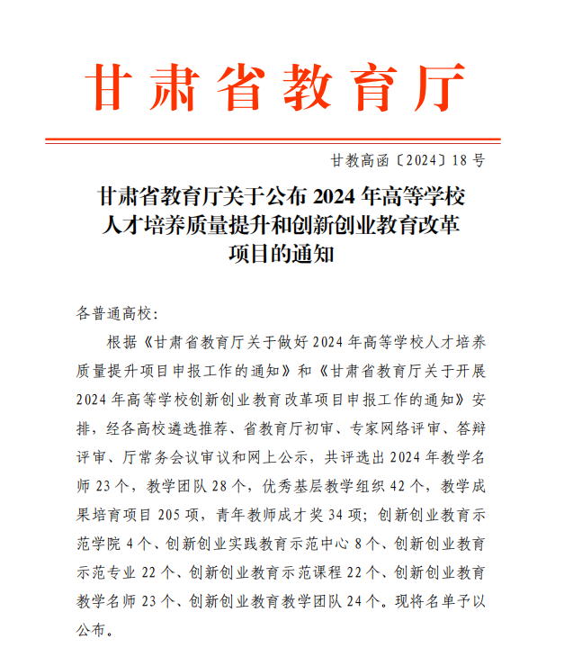 近日,甘肃省教育厅正式发布《关于公布 2024 年高等学校人才培养质量提升和创新创业教育改革项目的通知》。beat365在此次评选中成绩卓著,共计 14 个项目成功获得省级立项。其中,梁宝毓教授荣获省级教学名师称号,王静教授(经济管理学院)荣膺青年教师成才奖。团队建设成果显著,“大学生心理健康教育教学团队” 被评定为省级教学团队,“旅游管理教研室”“新闻学教研室” 获省级优秀基层教学组织认定。教学改革研究与实践领域亦收获颇丰,“新工科视角下‘化工工艺学’课程‘产教融合’教学改革研究与实践” 等 6 项课题获批省级教学成果培育项目。