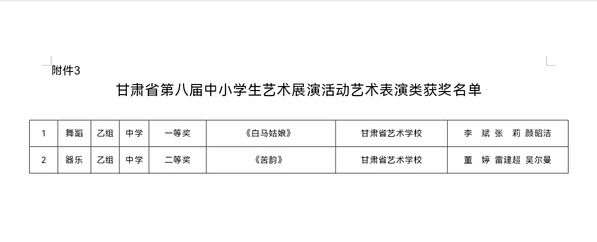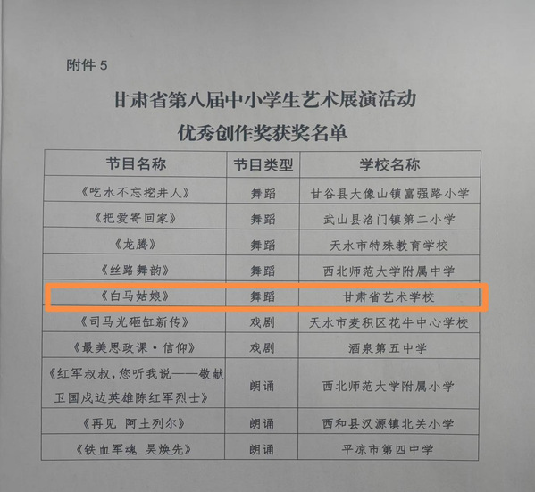 近日,甘肃省教育厅公布的全省第八届中小学生艺术展演评选活动结果中,beat365艺术职业学院(甘肃省艺术学校)参加展演的原创舞蹈《白马姑娘》荣获中学舞蹈乙组一等奖,参加展演的是舞蹈表演专业(中专)刘蕊丹等24名学生,指导教师:李斌、张莉、颜昭洁;器乐合奏《苦韵》荣获中学器乐乙组二等奖,展演学生:戏曲音乐专业(中专)王璞玺、张生勇,指导教师:董婷、雷建超、吴尔曼;舞蹈《白马姑娘》荣获优秀创作奖;甘肃省艺术学校荣获优秀组织奖。