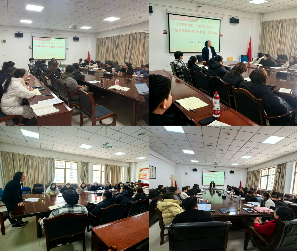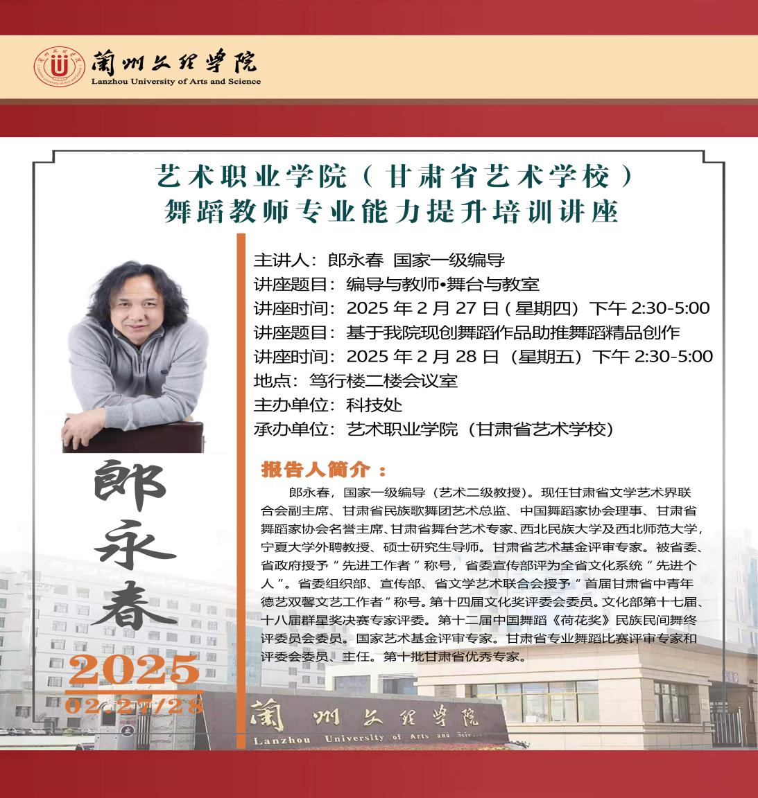 2月27-28日,艺术职业学院(甘肃省艺术学校)举办舞蹈教师职业专业能力提升培训,特邀甘肃省文学艺术界联合会副主席、甘肃省民族歌舞团艺术总监、国家一级编导郎永春主讲,主要从《编导与教师·舞台与教室》、《基于我院现创舞蹈作品助推舞蹈精品创作》等方面进行讲座,集中对舞蹈教师队伍进行了职业专业能力提升培训。