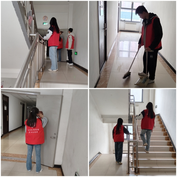 身穿红色马甲的学生党员在党委学生工作部老师的带领下,分组开始行动。有的拿着环保垃圾袋、夹子捡拾遗落在楼道中的白色垃圾,有的拿着扫帚清扫犄角旮旯处的烟头、碎屑,还有的将宿舍楼周边的单车摆放整齐。大家相互配合,认真仔细,努力将每一处角落都清理干净。经过一个多小时的大扫除,宿舍的楼面变得干净整洁了,宿舍周边的环境也得到了改善。