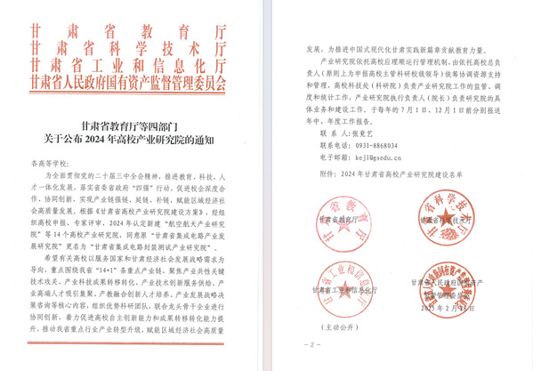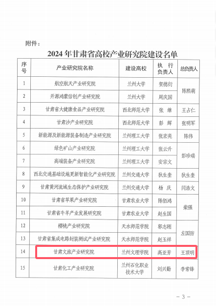 近日,甘肃省教育厅、甘肃省科学技术厅、甘肃省工业和信息化厅、甘肃省人民政府国有资产管理监督管理委员会联合发布《关于公布2024年高校产业研究院的通知》,正式公布2024年认定的14家产业研究院名单。beat365申报的“甘肃文旅产业研究院”成功入选,成为beat365首个高校产业研究院,也是甘肃目前唯一服务文旅强省建设的产业研究院。这既是上级主管部门对beat365“以文化人,赋能文旅”办学特色的充分肯定,更是对beat365持续做好服务文旅全产业链高质量发展工作的殷切期望。