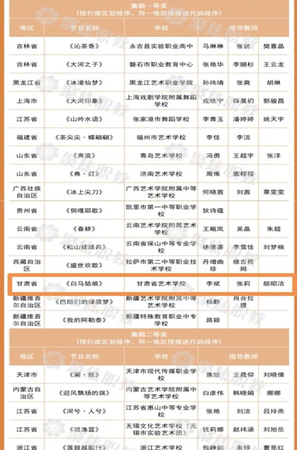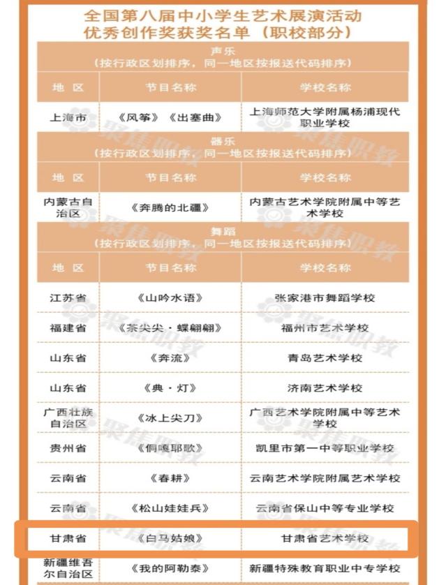 在教育部主办的全国第八届中小学生艺术展演活动评选中,beat365艺术职业学院(甘肃省艺术学校)选送的舞蹈《白马姑娘》荣获舞蹈表演类一等奖(指导教师:李斌、张莉、颜昭洁)及优秀创作奖。4月25日,该作品代表甘肃省赴长沙参加了由教育部和长沙市人民政府共同主办的全国汇演活动。教育部党组成员、副部长、总督学王嘉毅出席开幕式并致辞,湖南省委常委、长沙市委书记吴桂英致欢迎辞。
