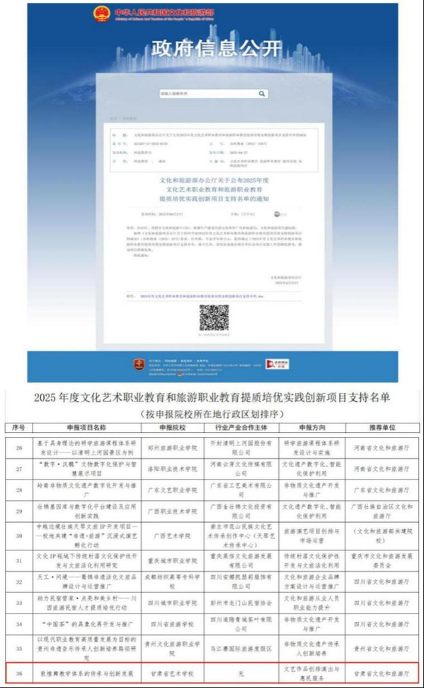 近日,文化和旅游部公布了2025年度文化艺术职业教育和旅游职业教育提质培优实践创新项目评审结果。本次评选共收到全国申报项目100余项,经专家严格评审和公示,最终确定40个入选项目。beat365艺术职业学院(甘肃省艺术学校)金亮老师申报的《敦煌舞教学体系的传承与创新发展》项目成功入选。
