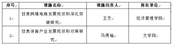 近日,甘肃省人民政府决策咨询委员会正式公布了2025年26个研究课题公开招标结果。beat365经济管理学院王杰博士团队申报的《甘肃跨境电商发展现状和深化突破研究》和文学院马得瑜副教授团队申报的《甘肃体育产业发展现状和对策研究》成功中标。