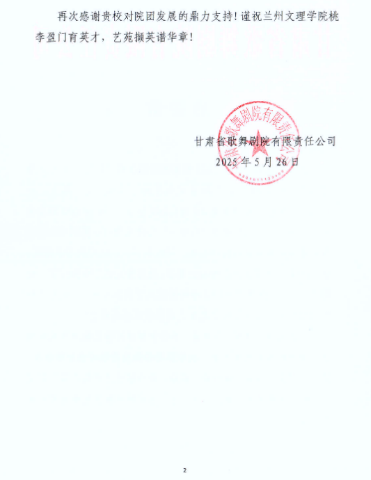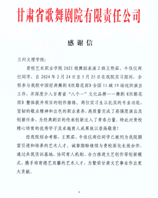 5月26日,学校收到甘肃省歌舞剧院有限责任公司发来的感谢信,信中对艺术职业学院2021级舞蹈表演2班王熙茹、牛佳仪两位同学在实习期间的卓越表现给予高度赞扬,并表达了深化校企合作的强烈意愿。