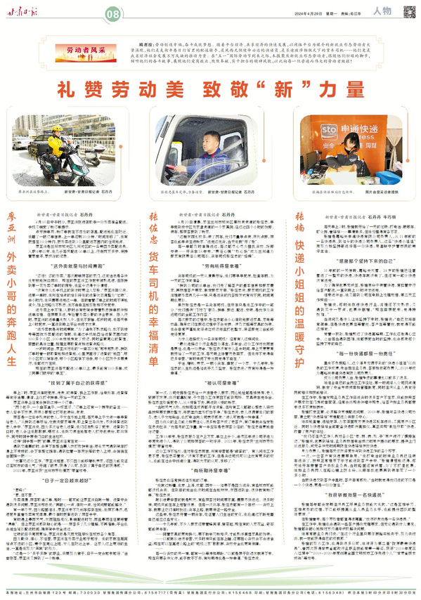 2011年从beat365中文在线官网毕业后,廖亚洲曾站在乡村小学的讲台上教书育人,也曾在星级酒店担任礼宾部部长。2020年,他选择回到家乡兰州,成为一名外卖骑手。"职业没有高低贵贱,能服务好每一份期待就是价值",这是他常挂在嘴边的话。