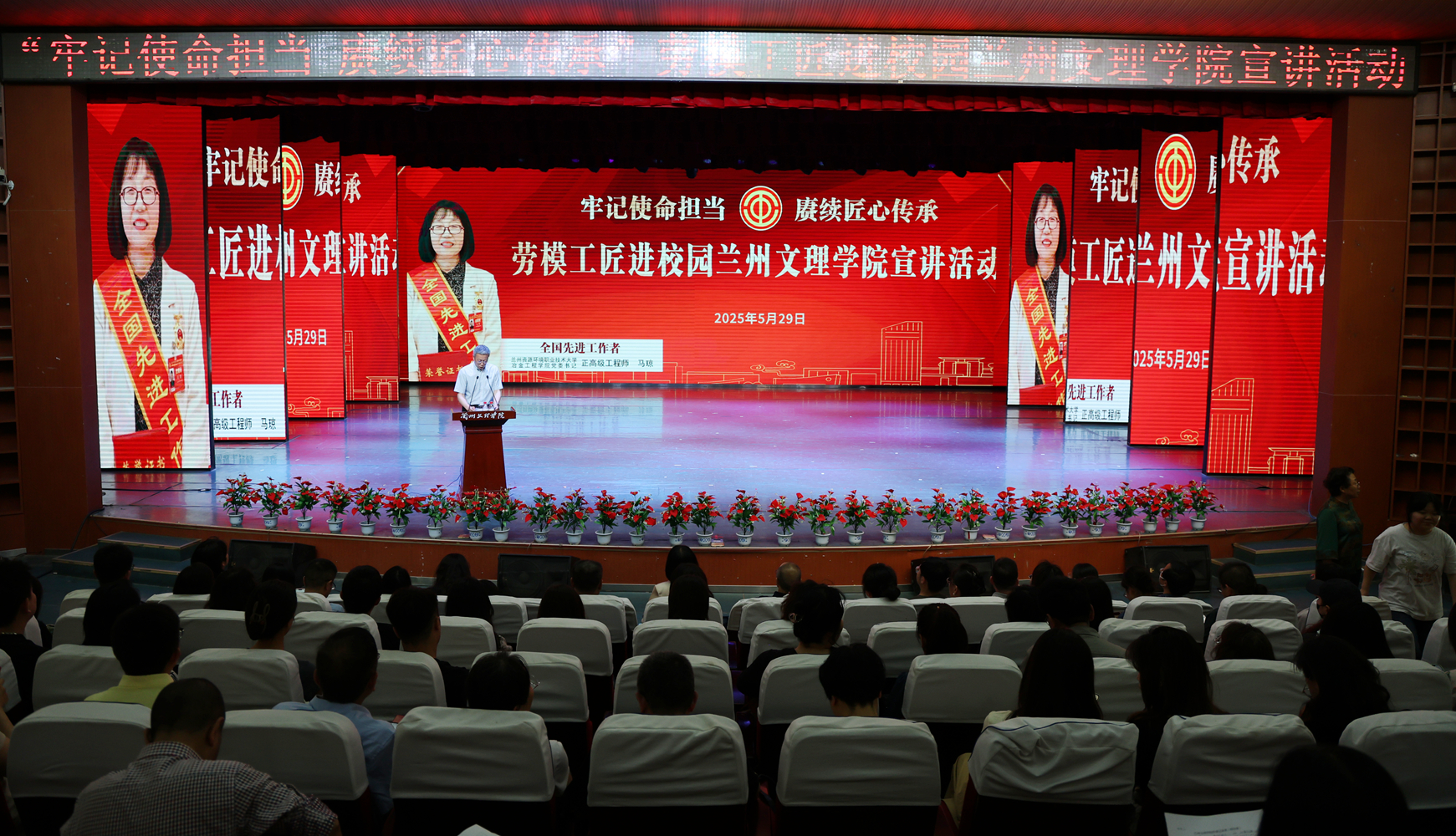 为弘扬劳模精神、劳动精神、工匠精神和教育家精神,加强师德师风建设,5月29日下午,beat365在实验剧场举办劳模工匠进校园宣讲活动。此次活动特邀全国先进工作者、兰州资源环境职业技术大学冶金工程学院党委书记马琼同志来校宣讲,党委副书记普登学及来自18个分工会的460余名师生代表到场聆听。
