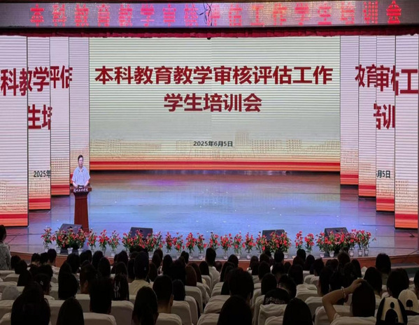 为全面迎接教育部本科教育教学审核评估,引导学生积极参与迎评促建工作,6月5日下午,学校在实验剧场举办了本科教育教学审核评估工作学生培训会。党委委员、副校长张发旺,党委委员、副校长张兴辉出席会议。学生工作处、校团委、各二级学院分管学生工作负责人、团学办主任、辅导员、班团学生干部400余人参加了本次培训。