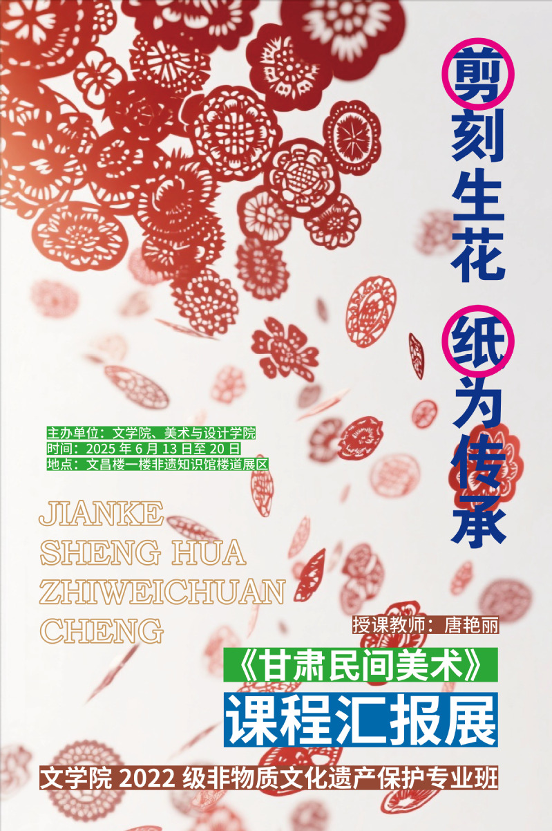 在2025年“文化和自然遗产日”即将到来之际,文学院2022级非物质文化遗产保护专业《甘肃民间美术》课程汇报展“剪刻生花 非遗正青春”于6月13日正式拉开帷幕,展览将持续至6月20日,在文昌楼一楼非遗知识馆楼道展区精彩呈现。