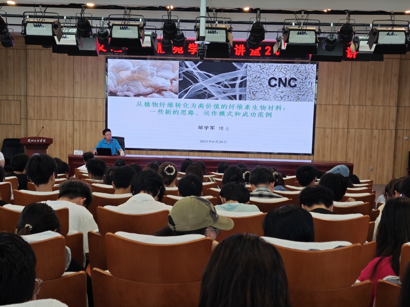 讲座中,邹学军教授围绕碳中和背景下植物纤维的高值化转化,重点从造纸行业研发创新的主要推力、面临的挑战与机遇以及现代硫酸盐浆厂的产品分类进行了深入讲解。凭借从实验室走向生产线丰富的实践经验,邹学军教授还分享了纤维素纳米晶体及纤维素长纤丝等创新案例,让在场师生对纤维基新材料有了更直观的认识。互动环节中,师生们踊跃提问,就国内外造纸行业发展差距、纸基功能材料应用推广过程中存在的问题进行了探讨,邹学军教授一一耐心进行了解答。
