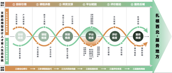 学院构建“目标引领—过程赋能—成效反哺”的闭环育人生态,以培养“新丝路设计师”为核心目标,明确人才三大定位:文化转译者:通晓丝路美学基因,坚守文化自信;技术整合者:掌握文物数字化、AI设计等前沿技能;产业创新者:能以设计驱动文旅资源转化,服务区域发展。
