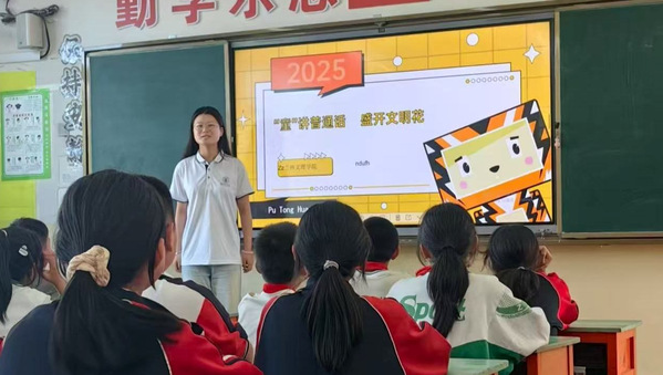 在街子小学的课堂上,队员们创新采用绕口令比拼、儿歌学唱等游戏化教学方式,让孩子们在轻松互动中建立语言规范意识,让普通话成为滋养童年成长的 “文化底色”。走进八坊十三巷非遗文化街区,队员们手把手指导商户用普通话介绍麸子醋酿造、葫芦雕刻、地毯编织等特色传统技艺,让方言里的文化故事通过规范语言走向更广阔的舞台。在东乡县的街头巷尾,队员们主动走近环卫师傅、嬉戏的孩童与纳凉的老人,耐心指导他们学说日常用语,让普通话融入乡村生活的点滴场景。