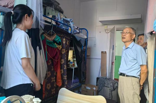 在学生宿舍,李敏骞逐一查看寝室设施、公共卫生及安全通道状况,指出要及时修复损坏家具、照明设备等问题,确保学生返校后拥有整洁、安全的住宿环境。