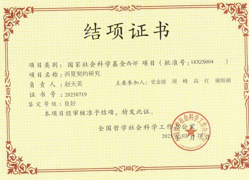 文学院赵天英老师主持的国家社科基金项目《西夏契约研究》顺利结项,获评“良好”等级。该项目前期产出4篇论文(含2篇C刊),最终成果达60万字。