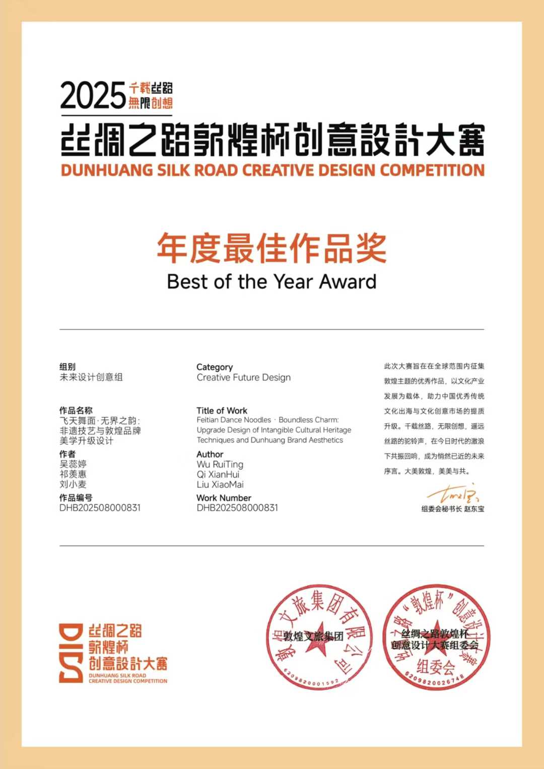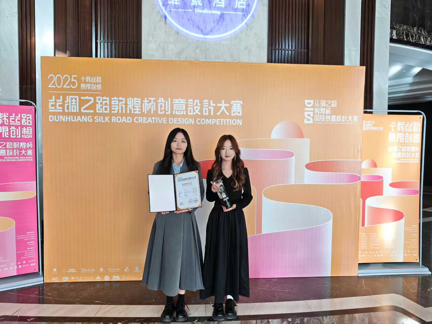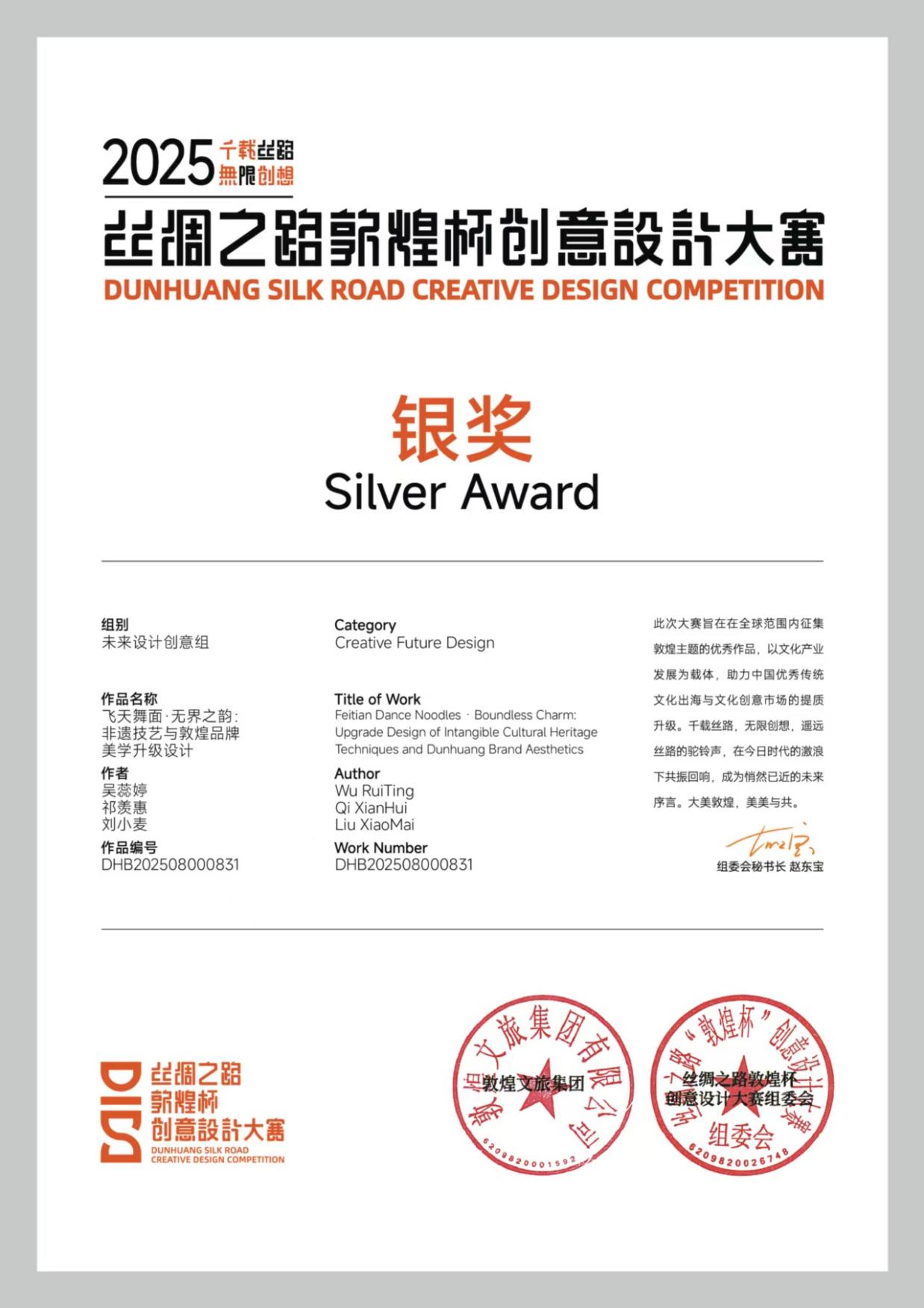 9月21日,由敦煌文旅集团主办的丝绸之路“敦煌杯”创意设计大赛颁奖典礼在敦煌无界艺术空间举行。本次大赛专家评委会由著名敦煌艺术专家常沙娜先生担任名誉主席,评审专家来自清华大学美术学院、中央美术学院等多所高校及相关行业机构。大赛共收到参赛作品1316件,最终评选出52件获奖作品。beat365美术与设计学院师生作品荣获“未来设计创意组”银奖及“年度最佳作品奖”。