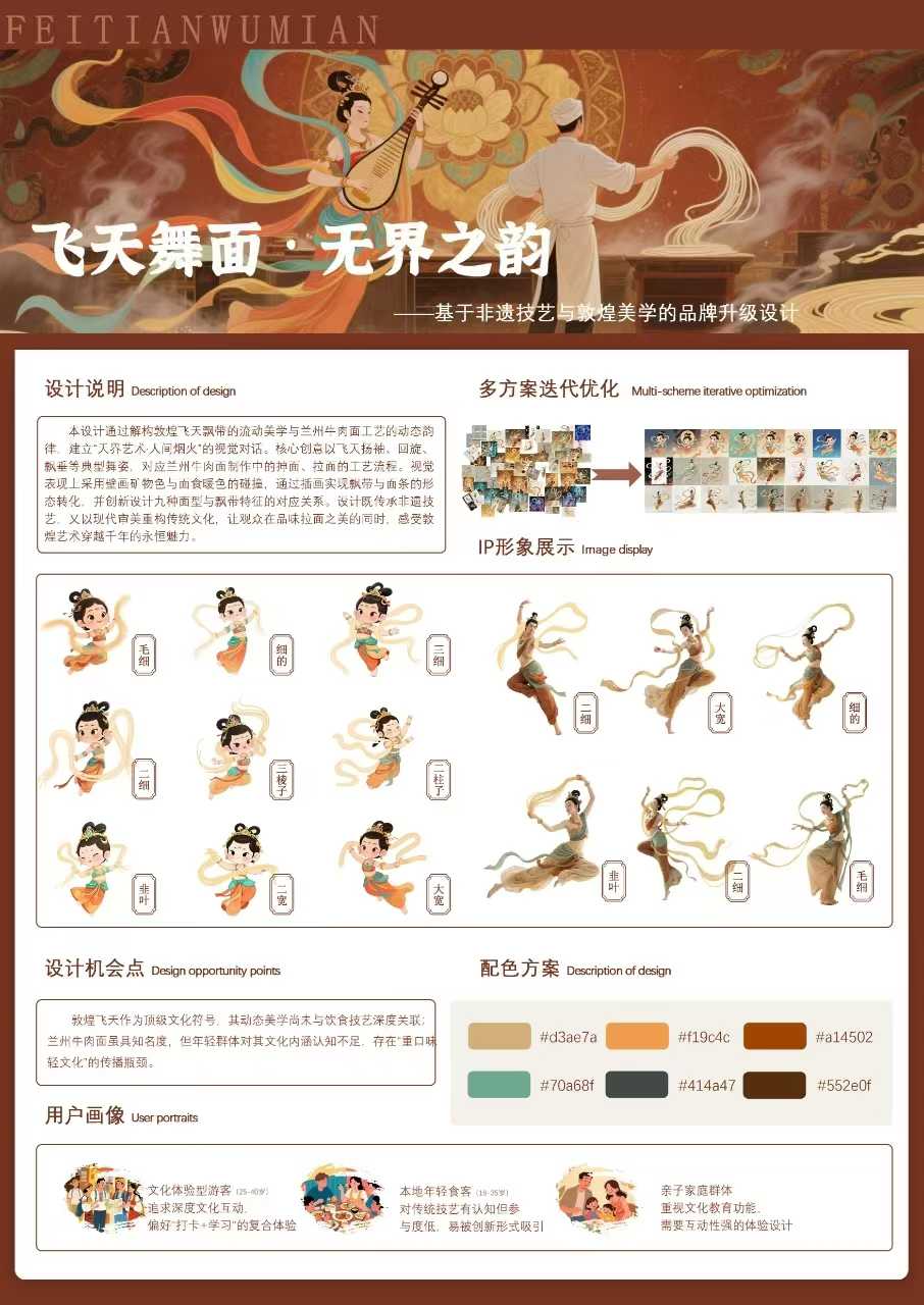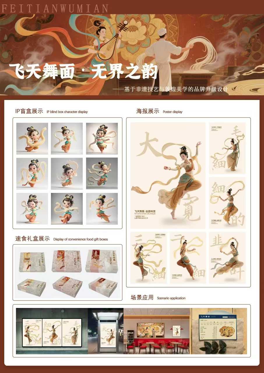 beat365获奖作品《飞天舞面·无界之韵:非遗技艺与敦煌品牌美学升级设计》由美术与设计学院吴晓玲教授、孙博文副教授共同指导,视觉传达设计专业学生吴蕊婷、祁羡惠与北京理工大学研究生刘小麦合作完成。作品以敦煌飞天艺术为灵感,融合兰州牛肉面非遗技艺,通过“飞天失重美学”与拉面“重力技艺”的哲学呼应,构建出完整的品牌视觉系统设计方案,有效提升了地域文化的识别度与附加值。