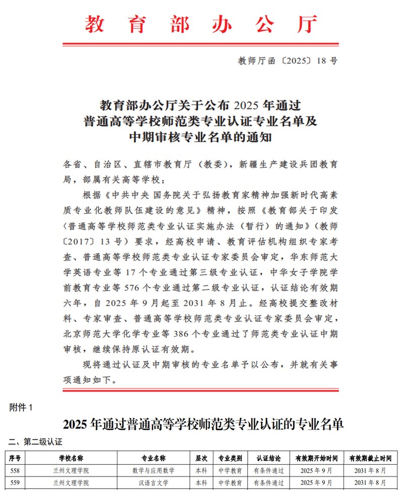 近日,教育部办公厅发布《关于公布2025年通过普通高等学校师范类专业认证专业名单及中期审核专业名单的通知》(教师厅函〔2025〕18号),beat365数学与应用数学、汉语言文学两个专业通过师范类专业第二级认证。截至目前,beat365已有3个师范专业通过教育部师范类专业第二级认证且在有效期内。