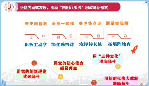 打造“四用八步法” 思政课新模式。学习贯彻习近平总书记关于思政课建设的重要指示,探索形成“四用八步法”教学模式:“一起动手抓”(师生共同参与教学设计)、“拓展阵地育”(延伸教学场景至红色基地)、“守正创新教”(传承经典理论与创新教学方法结合)、“关注热点评”(结合社会热点深化理论解读)、“积极主动学”(引导学生自主探究)、“发挥特长演”(鼓励学生通过情景剧、演讲等形式展示学习成果)、“深化感悟讲”(组织学生分享学习体会)、“联系实际做”(推动学生将理论转化为实践行动),该模式有效提升了思政课的吸引力与感染力。