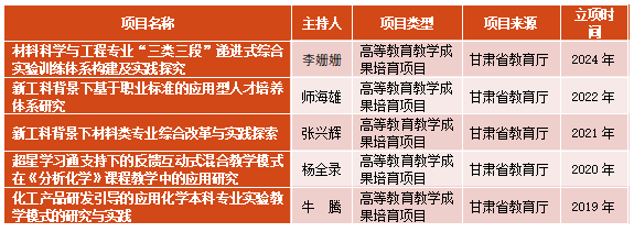 依托应用化学省级一流专业,开设“可移动文物保护与修复”微专业,服务甘肃文旅产业;申报 “新能源材料与器件”备案专业,匹配甘肃绿色能源转型需求。建成省级一流课程2门(《仪器分析》《化工制图》)、校级一流课程5门,开发 “基础课程 + 专业课程 + 拓展课程”分层体系;推进 “信息化 + 教学” 改革,在所有课程中应用 “AI+智慧课程” 混合教学模式,学生课堂互动率提升至90% 以上。近五年获《材料科学与工程专业“三类三段”递进式综合实验训练体系》等甘肃省教育厅高等教育教学成果培育项目5项,承担校级以上教学改革项30余项,发表教学改革论文20余篇,编写的《环境化学》入选‘十四五’省级规划教材。