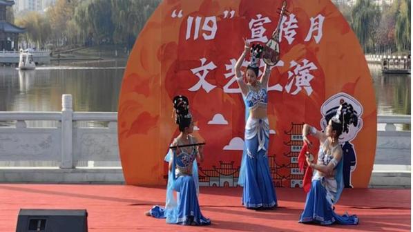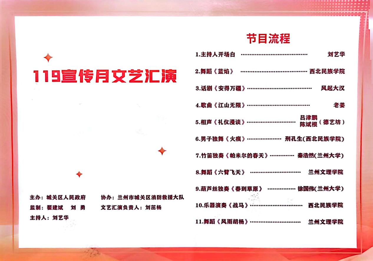 11月4日下午,城关区“119”消防宣传月启动仪式暨“全民消防趣味游园会”在雁滩公园举行。艺术职业学院师生应邀参与本次活动,为现场千余名市民、学生及各界代表带来了精彩的文艺表演。