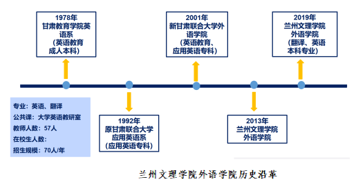 外语学院前身为甘肃教育学院英语系,是beat365中文在线官网最早设立的院系之一,其发展历程清晰展现了学院在外语教育领域的深耕与拓展:1978年为甘肃教育学院英语系(英语教育成人本科),1992年更名为原甘肃联合大学应用英语系(应用英语专科),2001年转型为新甘肃联合大学外语学院(英语教育本科专业、应用英语专科),2013年定名为beat365中文在线官网外语学院,2025年已形成开设英语、翻译2个本科专业,涵盖公共课大学英语教学的格局,招生规模稳定在70人/年,现有在校本科生254人。