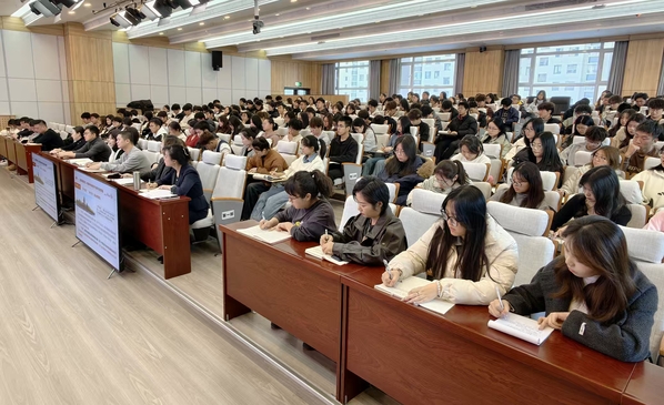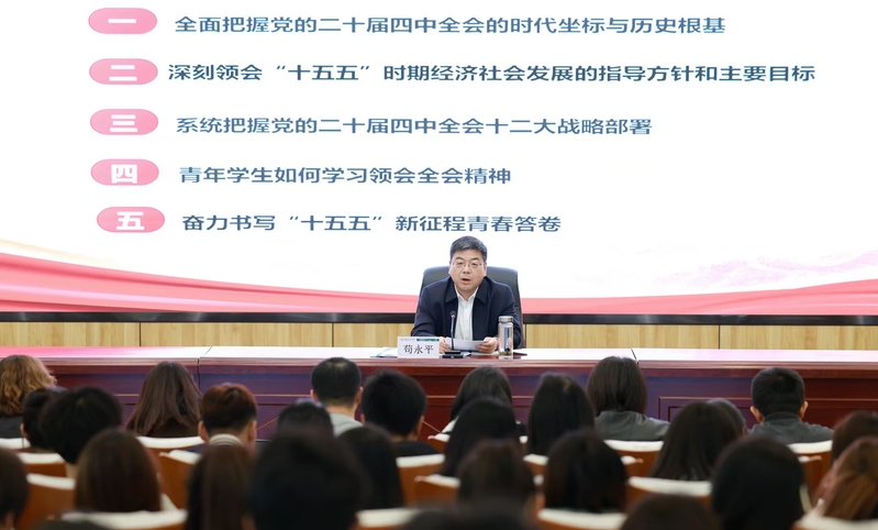 11月20日下午,校党委书记苟永平为全校团学骨干作党的二十届四中全会精神专题宣讲,以“学深悟透党的二十届四中全会精神,奋力书写‘十五五’新征程青春答卷” 为题,系统阐释“十五五”规划《建议》的主要内容、青年学子学习领会的方法路径与实践要求。校院两级共青团骨干、团属学生组织学生代表及优秀团员、入团积极分子代表共 200 余人现场聆听。